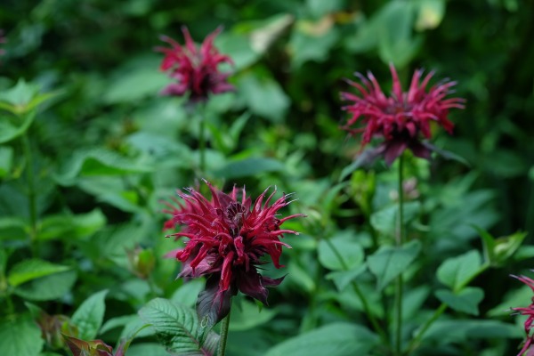 Als Monarda 'Donnerwolke' habe ich vor vielen Jahren mal eine sehr dunkel violette Pflanze bekommen, im Bild rechts und links unten im Monarden-Horst. In den letzten Jahren hat sich ein leuchtend purpurfarbener Sämling dazwischen geschoben und drängt sich immer weiter vor.