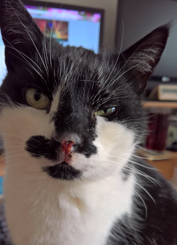 Das sieht schon wieder gut aus *seufzt* Was da jetzt grau schimmert, also auf dem Nasenrücken war auch alles blutig. Die Oberlippe im weißen Teil war auch deutlich größer raponiert.