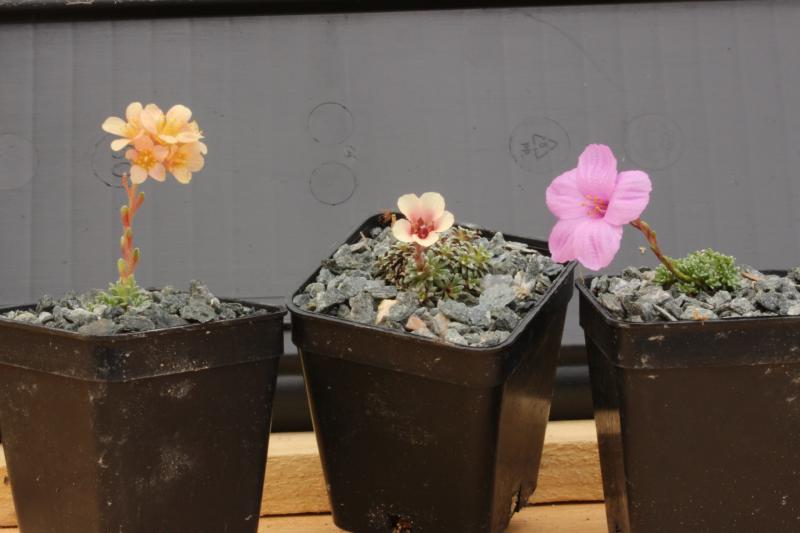 Bei den Saxifraga sieht die Zukunft vermutlich etwas optimistischer aus. Hier mal drei Jungpflanzen mit schöner Form und Farbe... v.l. Emil Holub , Tetin und Saxifraga x dinninaris (mit einer fast unwirklich großen Blüte)