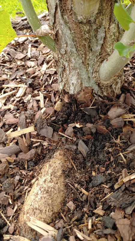 Nein, würde ich nie machen. Um Bäume generell nur mir der Schere. Und da ja die Fläche mit Rindenmulch groß drumherum ist kann da nichts passiert sein.