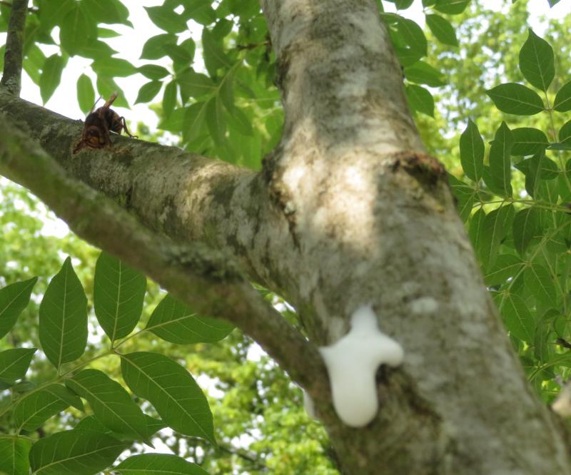 Vielleicht hat unsere Katze den Run auf den Baum losgetreten: Sie ist vor einiger Zeit hinaufgeklettert und hat am Stamm Kratzer hinterlassen. Die Rinde von Blumeneschen ist wohl sehr empfindlich, jedenfalls sind die Spuren deutlich zu sehen. Vielleicht ist da Baumsaft ausgetreten und hat die Hornissen initial angelockt.