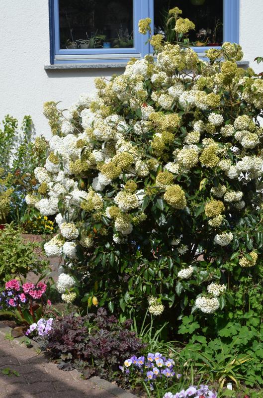 Viburnum 'Eskimo' könnte auch klappen. Ich weiß nur nicht, ob der groß genug wird, weil ich unseren kompakt halte.