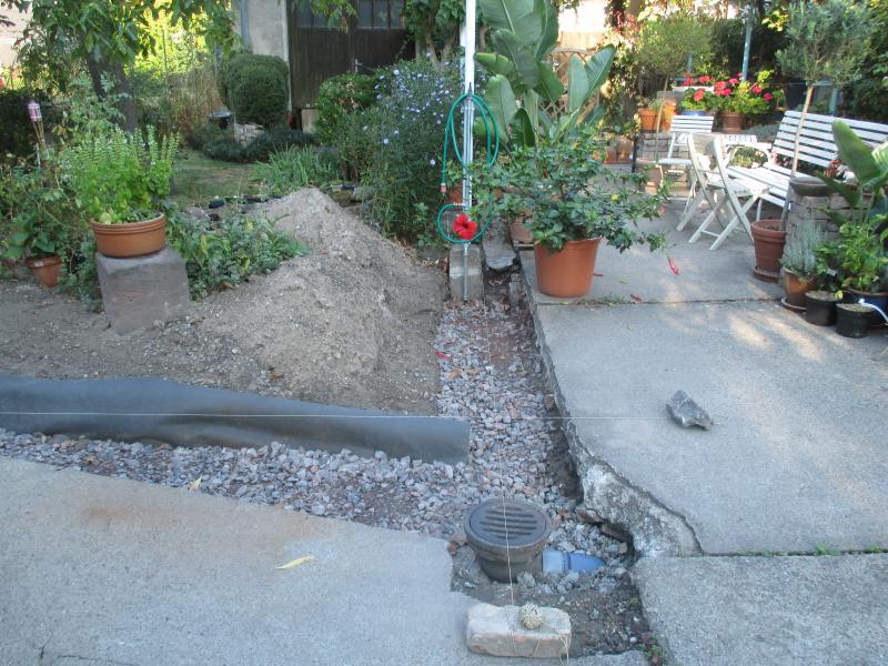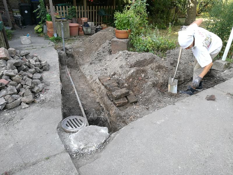 Die alten Abwasserrohre aus Keramik waren zerbrochen, sie wurden durch neue Plastikrohre ersetzt. Für den Abfluss habe ich in den Schacht ein Türmchen aus Ziegelsteinen gebaut. Auf dieses wurde der Abfluss gesetzt. Wenn ich dann Magerbeton für die Randsteine anrühre, bekommt der Abfluss auch einen Klacks ab, um ihn zu fixieren.