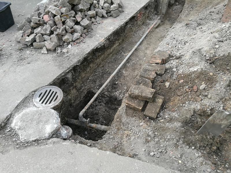 Er war in einem großen Klumpen harten Betons eingegossen. Das Ganze hatte sich gesenkt, so dass das Regenwasser neben dem Abfluss unter dem Beton sich einen Weg suchte.
