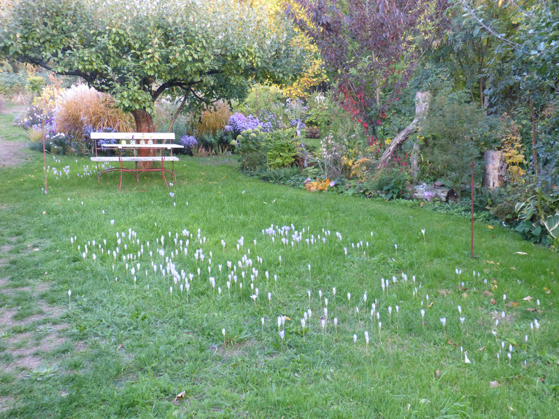 Herbstkrokusse passen irgendwie besser, weil der Rasen im Winter nicht gemäht wird. Mit Frühjahrskrokussen könnte das eng werden.