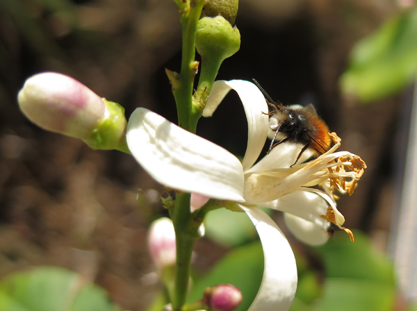 Heute waren die ersten zwei Holzbienen da ... verrücktes Wetter. Dabei war es mit 13° gar nicht soo warm, und im Schatten ist der Boden sogar noch bis oben gefroren. Ich hab ihnen ein blühendes Zitronenbäumchen rausgestellt, damit sie was zum Naschen haben. 8)