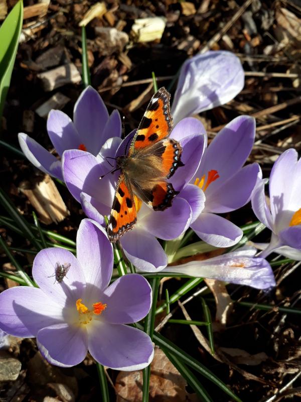 Heute hat ein kleiner Fuchs einige Krokusse mit heftigem Flügelschlag gegen nervige Bienen verteidigt...