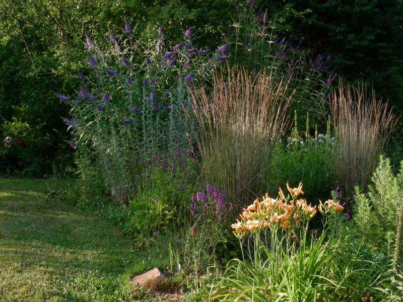 noch mal die Pflanzung mit den Buddlejen. Rechts von Lochinch die beiden Empire Blue und Black Knight.