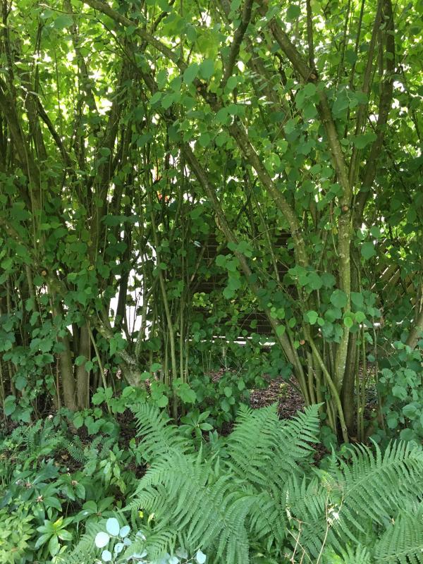 Nur zum Schuppen-Eingang, wo ich öfters seitlich herumschnippelte, trieben die Stämme mehr Laub: