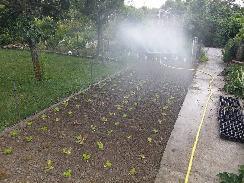 Hier mal 2 Bilder dazu. Ich lasse sie meistens länger laufen um schondend zu bewässern. Der 4er Balken zerstäubt 12-15Liter pro Minute, mein 3er rund 10Liter.