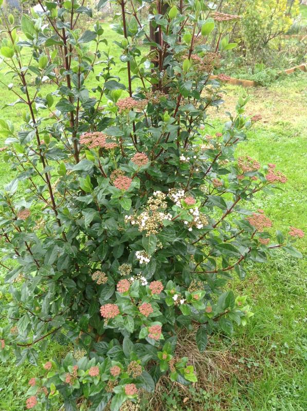 Den habe ich geschenkt bekommen, von meiner Schwester:"du weisst schon, dieser Winterblüher". Er wächst langsam, aber stetig, Viburnum tinus.