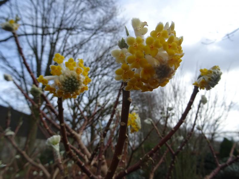 Ich habe hier mal ein auffallendes Gehoelz fuer Euch mit der Bitte um Identifikation. Umwerfender Fruehlingsdurft schon von Weitem. Ich dachte, das muesse einfach eine Hamamelis sein, aber die Bleutenblaetter waren viel glatter und kuerzer als bei allen Bildern, die ich so finde...