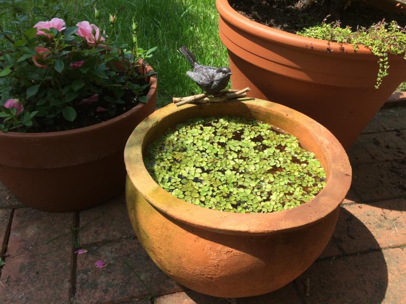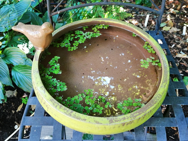 ...und zum anderen eine alte Terracottaschale, die mit Schwimmfarn ausgestattet wurde. Beide Varianten sind totale Insektenmagneten und alle meine kleinen Gäste können ihren Durst stillen, ohne ihr Leben zu riskieren. Der Umstand, dass die Vogeltränken jetzt praktisch frei von toten Insekten sind, zeigt die Bedeutsamkeit von speziellen Insektentränken - und für den Gartenmenschen ist es ebenfalls eine große Freude auf mehreren Ebenen :)