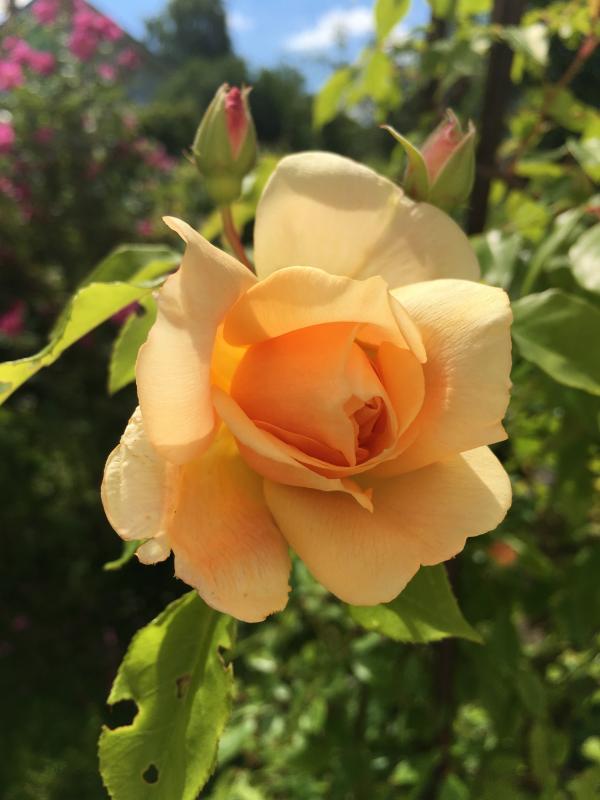 duft!!! hat die kletternde devoniensis mit ihrem changierenden primelgelb, das auch mal rosa überhaucht und apricot getönt daherkommt - leider ist sie ein himmelsstürmer und blüht gern in schwindelerregender höhe; eine rose für 'on the top' ;D ;). mit stacheln ist aber zu rechnen ;) ;) ;)