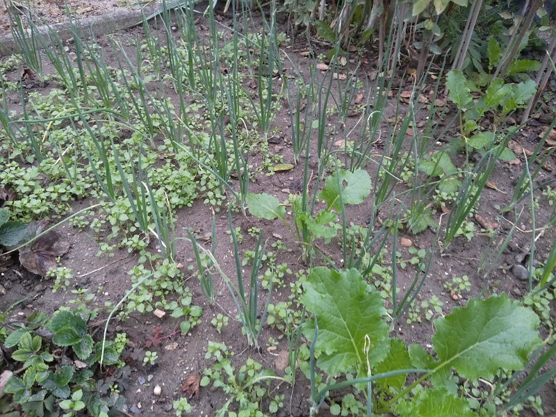 Die Vogelmiere macht sich prächtig zwischen den Zwiebeln.