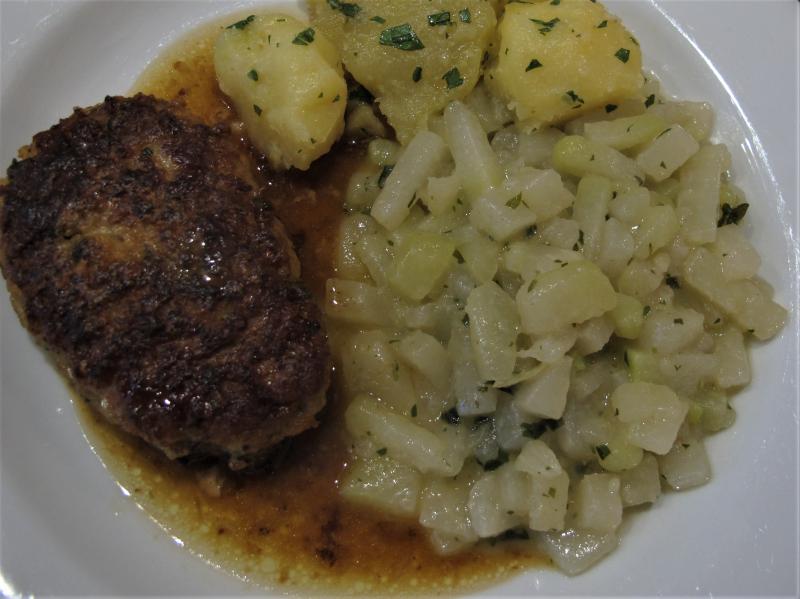 Faschiertes Hendlbutterschnitzl, Kohlrabi, Petersilerdäpfl.