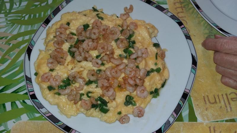 Hier: Eierpfannkuchen mit Schnittlauch und Garnelen, grüner Salat mit Rucola, Baguette.