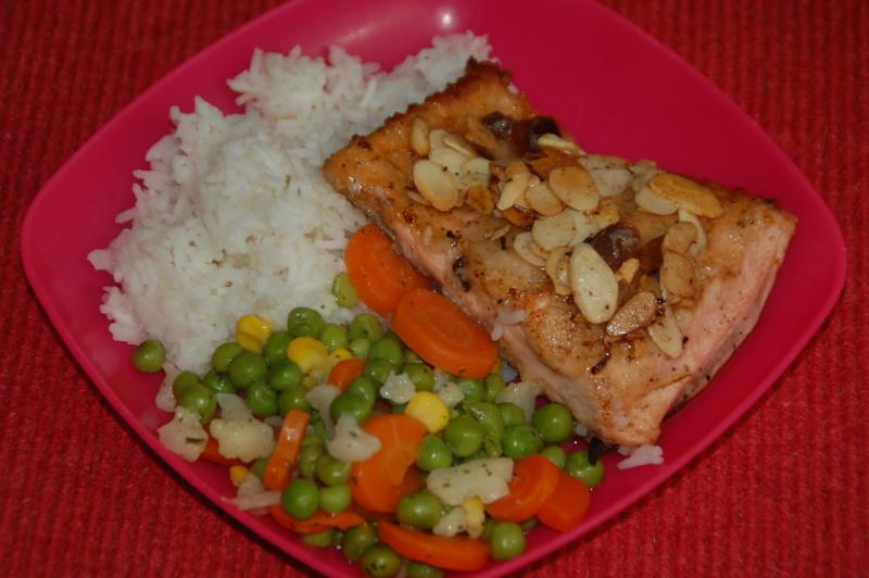 Basmatireis, Mischgemüse und Lachsforellenfilet mit Mandelblättchen