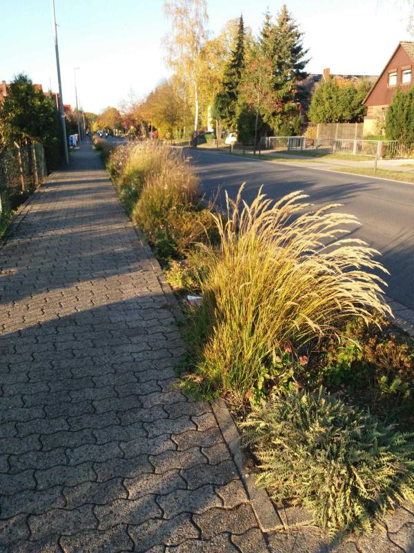 Als Fazit: Tretminen und Müll sind immer nervig, aber Einweghandschuhe helfen. Die Pflanzung hat einen höheren Durchlauf an Einzelpflanzen. Es entstehen aber immer wieder freie Flächen zum Experimentieren. Diebstähle und Zerstörung halten sich in Grenzen. Es gibt viel Lob von Passanten und die Umweltbetriebe rasieren nicht alles wild runter. Es sieht toll aus und erfreut jedes Mal beim Vorbeigehen.