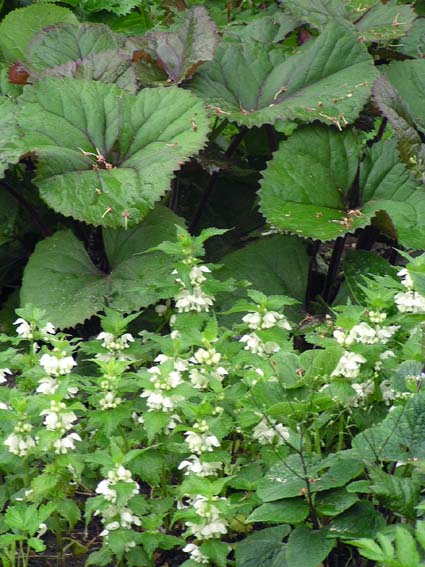 Bei mir stehen Inula magnifica/Riesenalant und Rodgersia tabularis. Inula ist sehr praktisch bei der Unterdrückung von Giersch, da die Blätter nichts hochkommen lassen; wenn man vier Jungpflanzen zu einem Rechteck von einem Meter Kantenlänge pflanzt, hat man im folgenden Jahr ungefähr zwei mal zwei Meter unkrautfrei. Schöne hellgrüne/apfelgrüne, sehr große Blätter, die gelben Blüten sehen aus wie von Kinderhand gemalte Sonnen