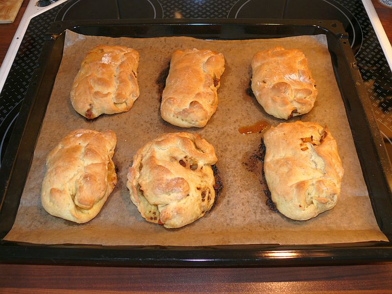 Heute gab es Hefeteigtaschen mit würzigem Hackfleisch, etwas ausgelaufen und