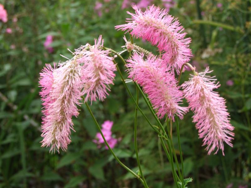 Hier blüht Sanguisorba 'Pink Brushes'auf frischem Boden.leider doch nicht so standfest wie beschrieben.Dafür aber dicke Flaschenbürsten.