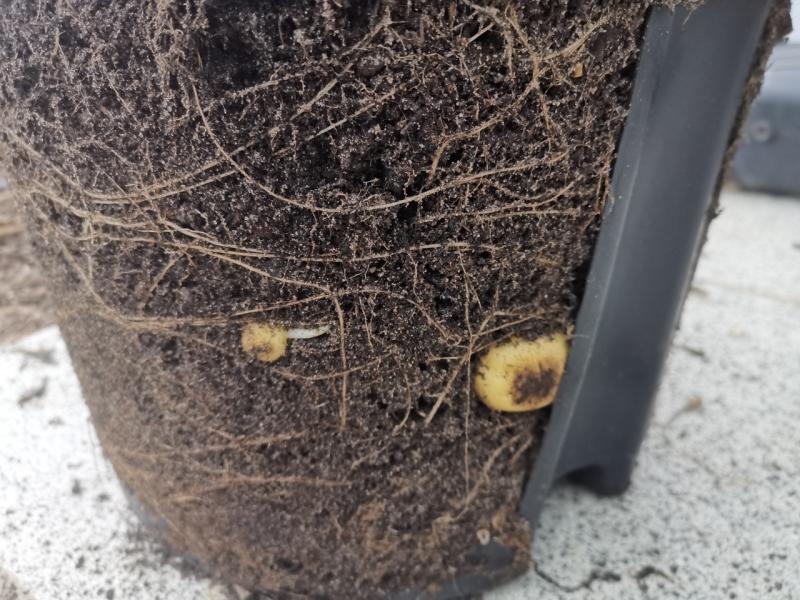 Im Topf gibt es etliches an Wurzelwerk, aber die Kartoffeln scheinen in den letzten 4 Wochen nicht besonders viel größer geworden zu sein (Vergleichsbild im Beitrag vom 27.2.). Solange es im Freien frostfrei war, haben sie auf der Terrasse gestanden, bei Frostgefahr sind sie in den Wintergarten gewandert (worden). Ab übermorgen soll hier der Nachtfrost wieder vorbei sein, dann machen sie erst mal wieder keine Arbeit.
