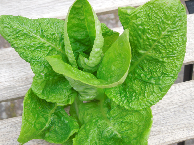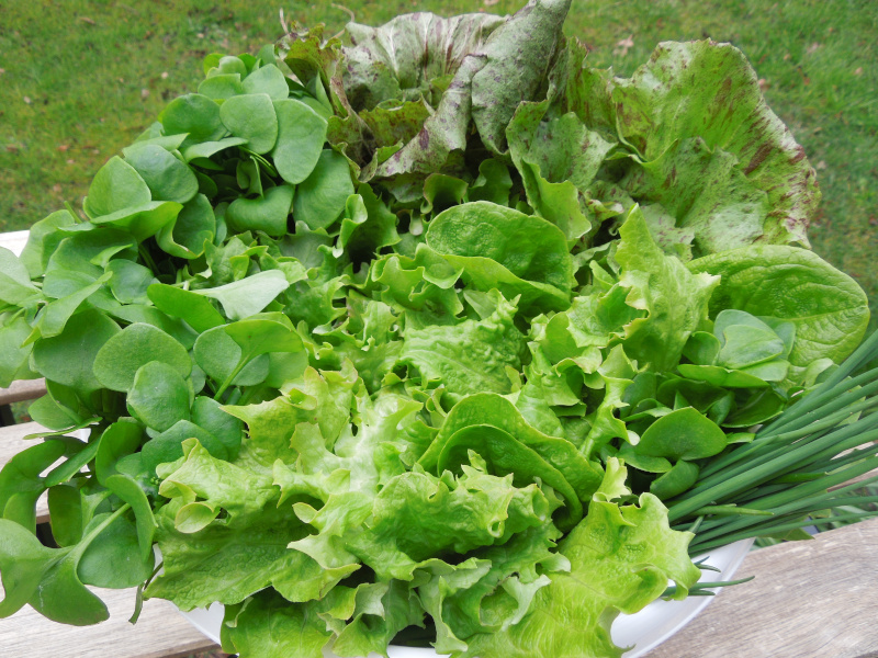 Selbstausgesäter Eisbergsalat und Postelein, im Herbst zu spät gepflanzter Radicchio und eine Handvoll Schnittlauch.