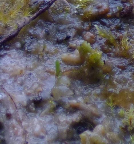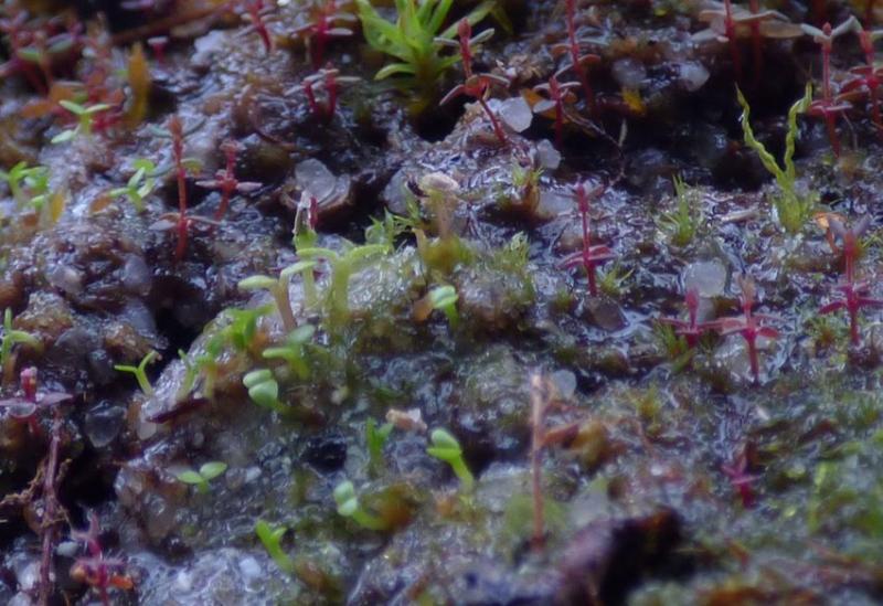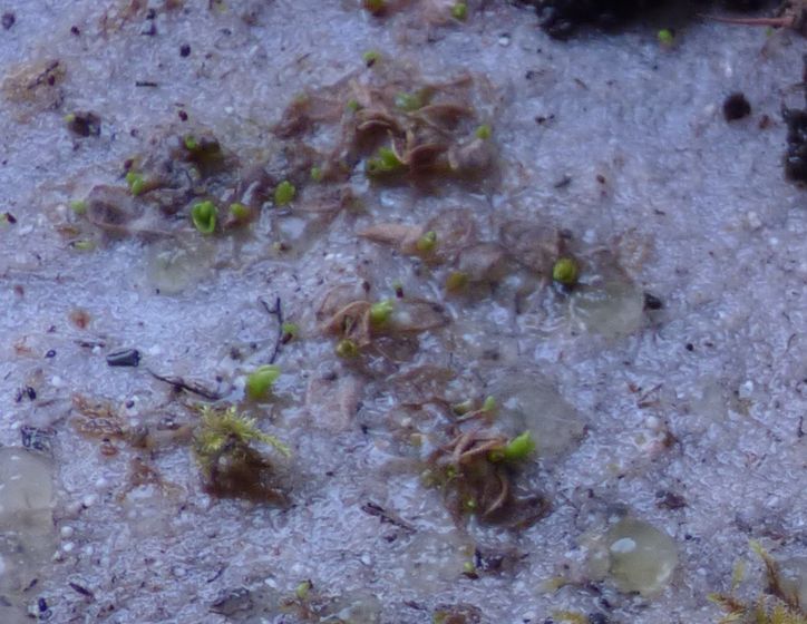 Die Pinguicula treiben aus ihren Winterknospen, aber auch viele der Samen die letzten Sommer nicht keimen wollten haben es sich nach der Überwinterung überlegt. Ganz unten sind die neuen Keimlinge, Das findet aber auf der ganzen Platte statt.