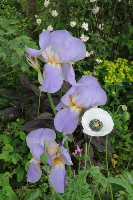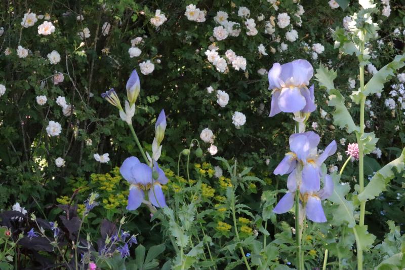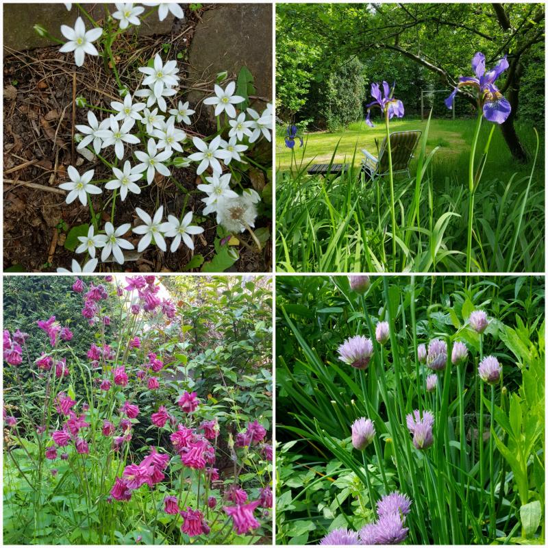Von hier im Bild nichts besonderes : Milchstern, Akelei, Iris sibirica, Schnittlauch