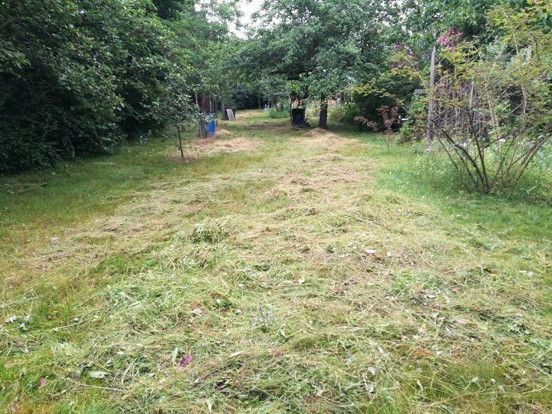 Heute habe ich das kleine Stück am Gemüsegarten noch mit der Sense behandelt. Wenn man es nicht so kann und keine Übung hat, dann muss man deutlich öfter die Sense schwingen. Ich hatte jedenfalls nach den paar qm genug und Schweiß nicht nur auf der Stirn.