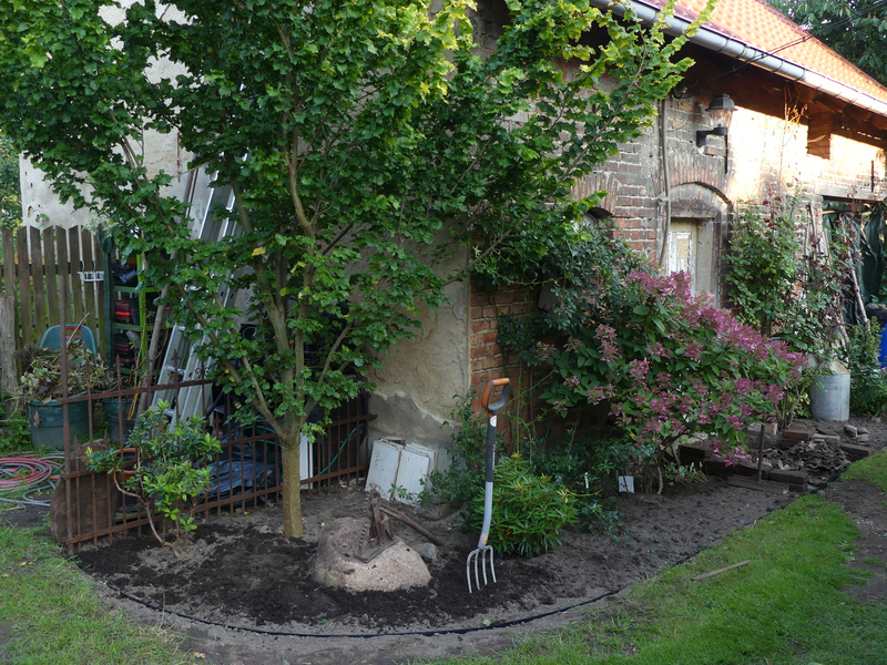 Heute ging es direkt weiter. Beetkante gesetzt, Unmengen Schutt aus der Erde geholt, probeweise ein Feld des alten Eisenzauns aufgestellt, einen Findling rangekarrt und immerhin schonmal zwei Rhodos in die Erde gebracht.