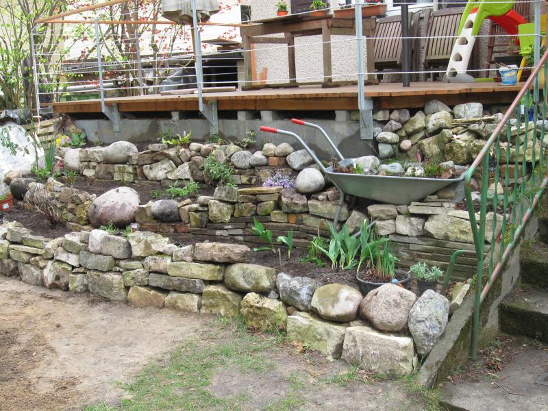 Die Mauer und das Hochbeet. In den offenen Rand kommen Steingartenpflanzen, Thymian, Polsterphlox, Zwergpenstemon, Efeu hängend und Sommerblüher