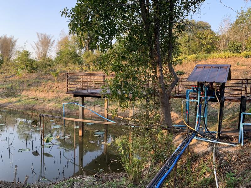 Die jetzige Konstruktion ist so, dass von den Pumpen zwei PVC-Rohre als Saugleitung parallel zur Wasseroberfläche hinaus laufen, und es dann einen 90-Grad Bogen nach unten gibt. Vom 90-Grad Boden bis zum Saugkorb sind es vielleicht vier oder fünf Meter. Von dort bis zum Ufer ist die Entfernung aber länger.