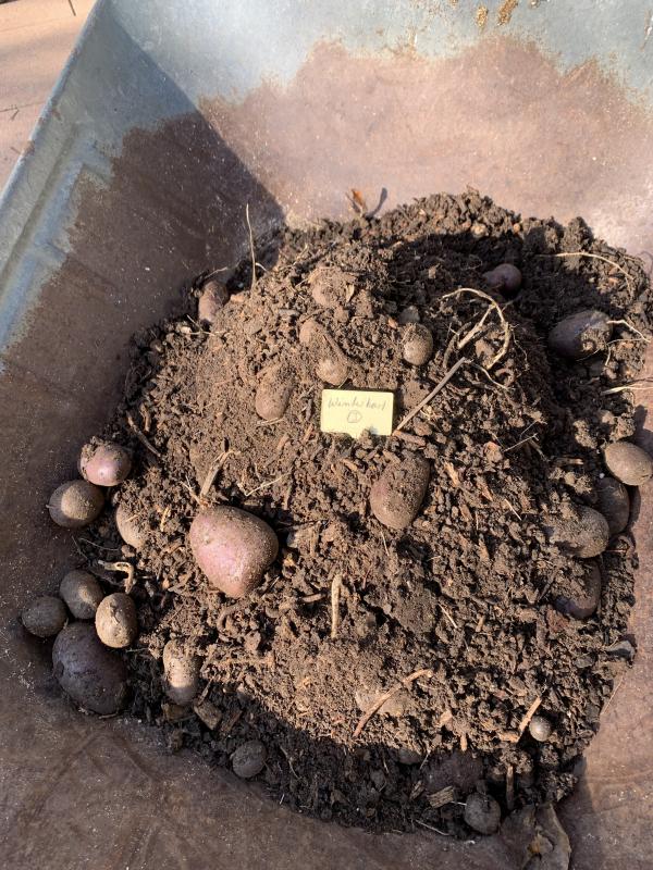 Gestern habe ich den vorletzten Kartoffeltopf in die Schubkarre gekippt. Der Ertrag war richtig gut und die Farbe spektakulär :) . Zur Sorte kann ich nur sagen, dass es eine sämlingsvermehrte Kartoffel von Michaelbasso mit Arbeitstitel "Winterkartoffel" ist.