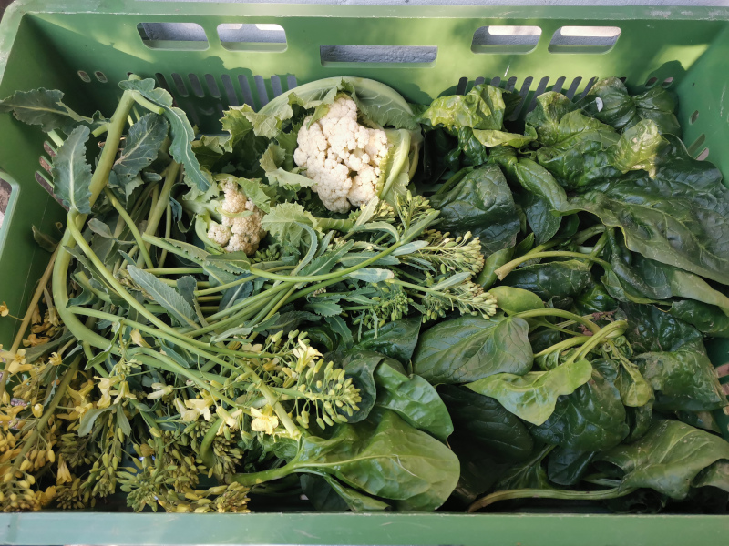 Gestern habe ich Spinat und Blumenkohl fürs Abendessen geerntet. Links im Bild noch ein paar Kohlschossen. Oder wie nennt man das, wenn man Blütentriebe für die Küche erntet?