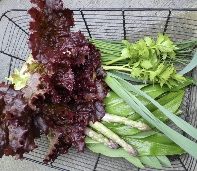 Schnittlauch, Bärlauch, Knoblauch, Salat, bisschen Liebstöckel und ein winziges bisschen Spargel für einen Kräuterquark.