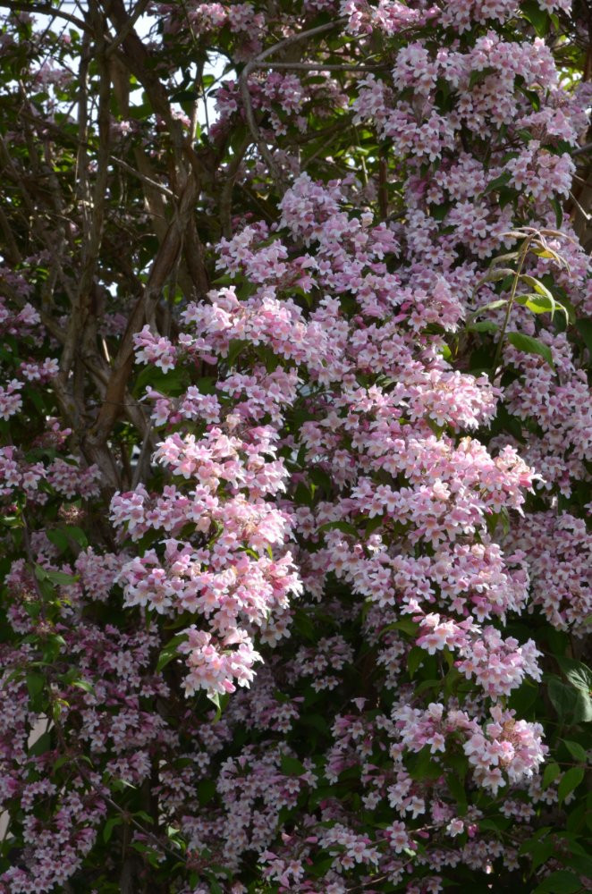 Auf dem Bild unten sieht man relativ dünne Stämme, das ist eine zweite Pflanze, womöglich ein Sämling, denn die Blüten sind etwas kleiner und heller als bei dem alten Exemplar. Sie steht quasi unter der Krone der alten Kolkwitzie, ist aber auch schon deutlich höher als zwei Meter.
