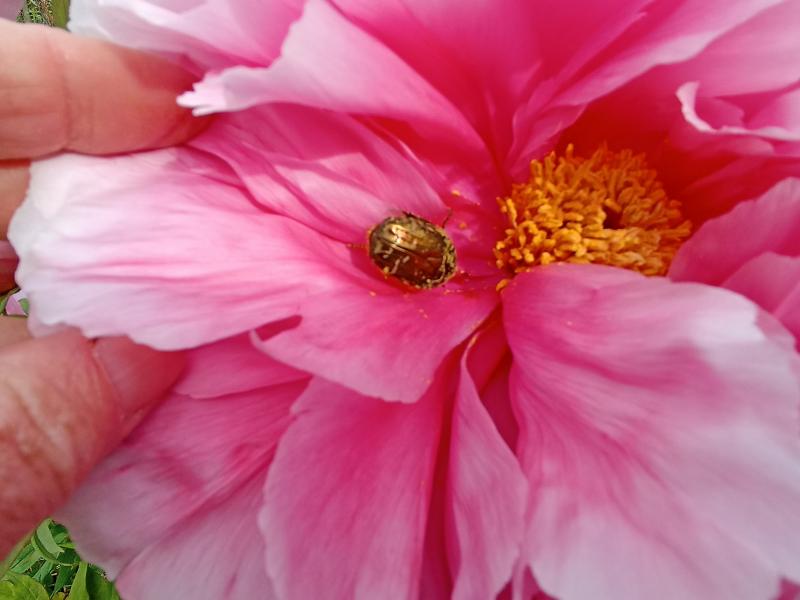 Wer hat sich denn hier kupferfarben glänzend in der Blüte einer Strauchpfingstrose kräftig mit Pollen eingepudert?