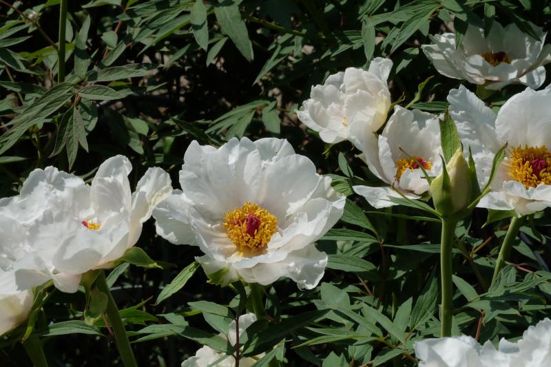 Oder die, die Zwerge bleiben: Choisya 'White Dazzler' und Paeonia suffruticosa, ohne Sortennamen.