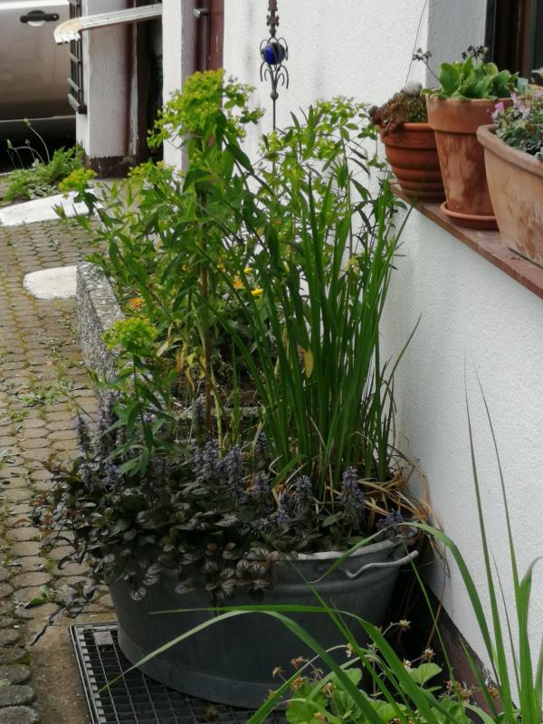 Da ich meine Zinkwannen nicht löchern wollte, sind daraus Sumpf- bzw. wechselfeuchte Kübel geworden. Geum rivale, Euphorbia palustris, Molinia arundinacea, Ajuga reptans halten das gut aus, Sysirinchium angustifolium littorale (mit S. angustifolium plane ich den nächsten Versuch ::)) hat die Oma für ein Ungras gehalten und gejätet. Dem war es glaube ich aber auch zu kalt, es hat deutlich geschwächelt, Mazus reptans ist ebenfalls rückwärts gewachsen und völlig verschwunden.