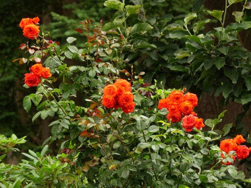 Immerhin haben wir Rosen an anderen Stellen und zwar inmitten von Rhododendron und Magnolien, wo wir den Boden mit sehr großen Humusmengen im Laufe der Jahre angereichert haben. Dort wächst z.B. 'Salita' im Halbschatten mit kräftigen Trieben und ungespritzt praktisch ohne Krankheiten