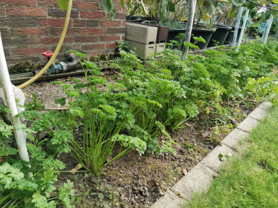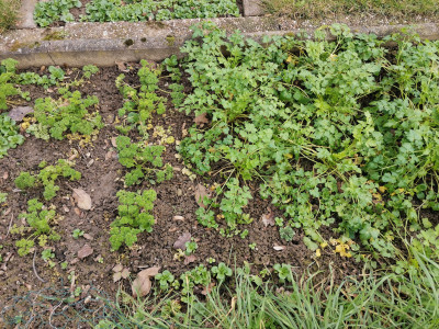 Ich pflanze jedes Jahr etwas glatte Petersilie, die ich als Setzlingekaufe, in mein kleines Gewächshaus. Dieses Jahr blühte sie über lange Zeit. Ein Fest für allerlei geflügelte Pollenliebhaber. Die abgeblühten Blütenstände warf ich auf den hochbaufgeschichteten Kompost und dachte nicht mehr daran. Jetzt ist der ganze Haufen von junger frischer Petersilie bedeckt. Eine absichtsvolle Aussaat ist mir übrigens nie geglückt. ;D