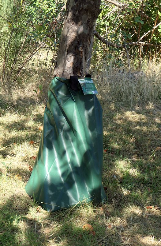 An einem größeren Baum funktioniert es recht gut. Man merkt das auch an der Sickergeschwindigkeit. Wenn der Sack nicht gut auf seiner durchlässigen Unterseite steht, dauert es viel länger, bis er sich leert.