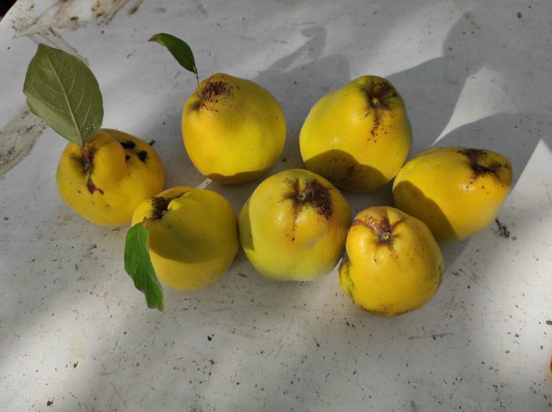 Ernte außer Walnüssen: 1,7 Kilo - genau sieben Stück - sehr schöne Birnenquitten von dem tapferen kleinen Quitterich. Ich hatte so mit ihm gelitten in der Sommerhitze.