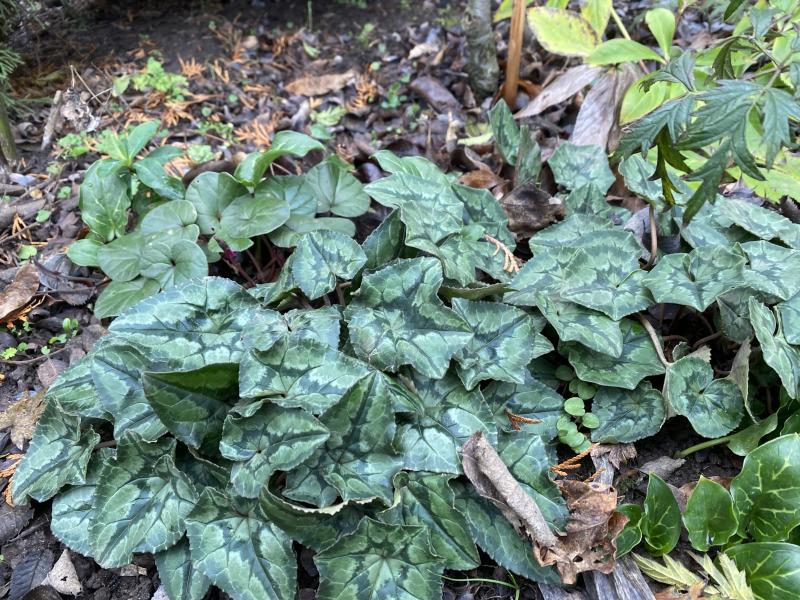 Ich bin ziemlich unerfahren bei den Cyclamen, leider. Und habe mal ein Foto gemacht von einer Stelle, wo weiße C. Hederifolium neben kräftig pinken C. Coum wachsen. Die Hederifolium sehen viel kräftiger aus. Stehen sie zu nah beieinander? Und dann kommt da auch noch unmittelbar daneben ein Aronstab raus. Sollte ich das alles mehr voneinander trennen? Wenn ja, am besten wann?