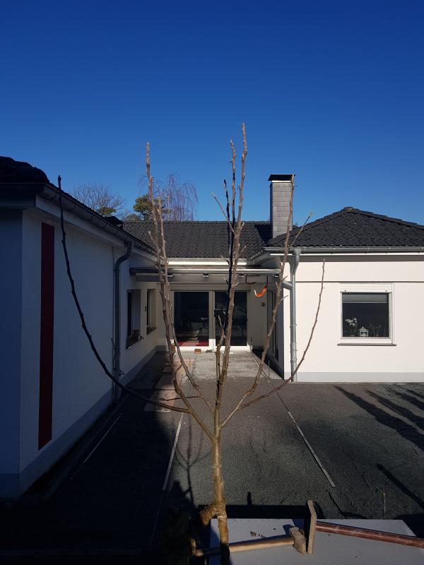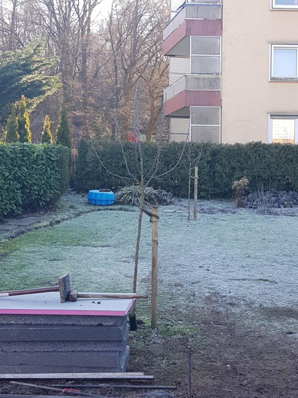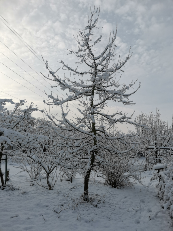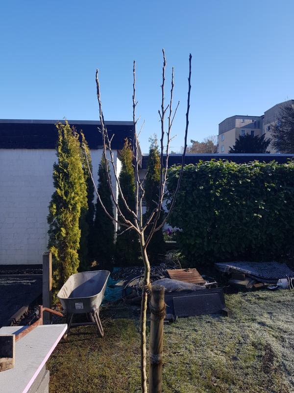 Jetzt bin ich gespannt auf die Experten. Ich Laie hätte gesagt, der schaut gut aus, schön gleichmäßige Krone. Senken werden sich die Zweige wohl von selbst, wenn sie sich verzweigen und erst mal schwerer werden. ???