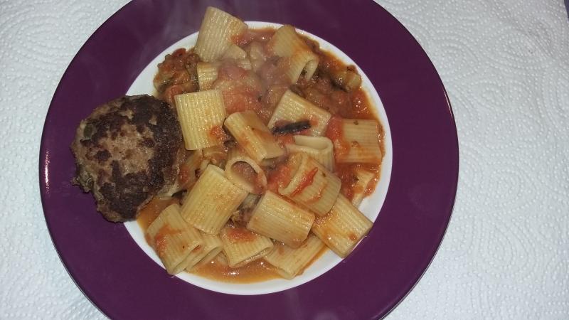 Hier gab es mezzi rigatoni in einer Tomaten-Auberginensauce mit Parmesan, dazu - völlig unitalienisch ;) - kalte Frikadellen von gestern.