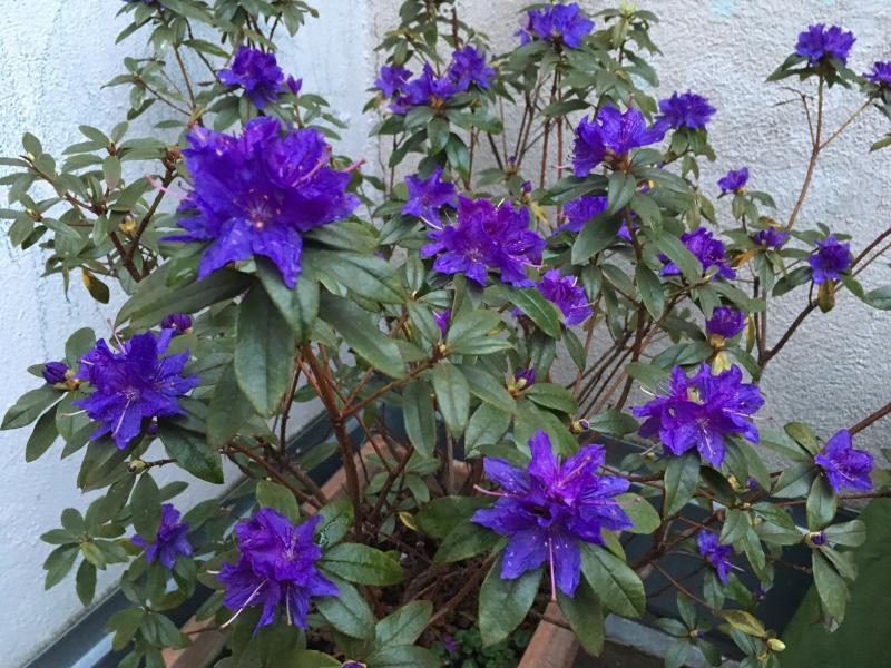Schön blau ist Rhododendron russatum ‘Gletschernacht’. Aber man muss abends fotografieren.
