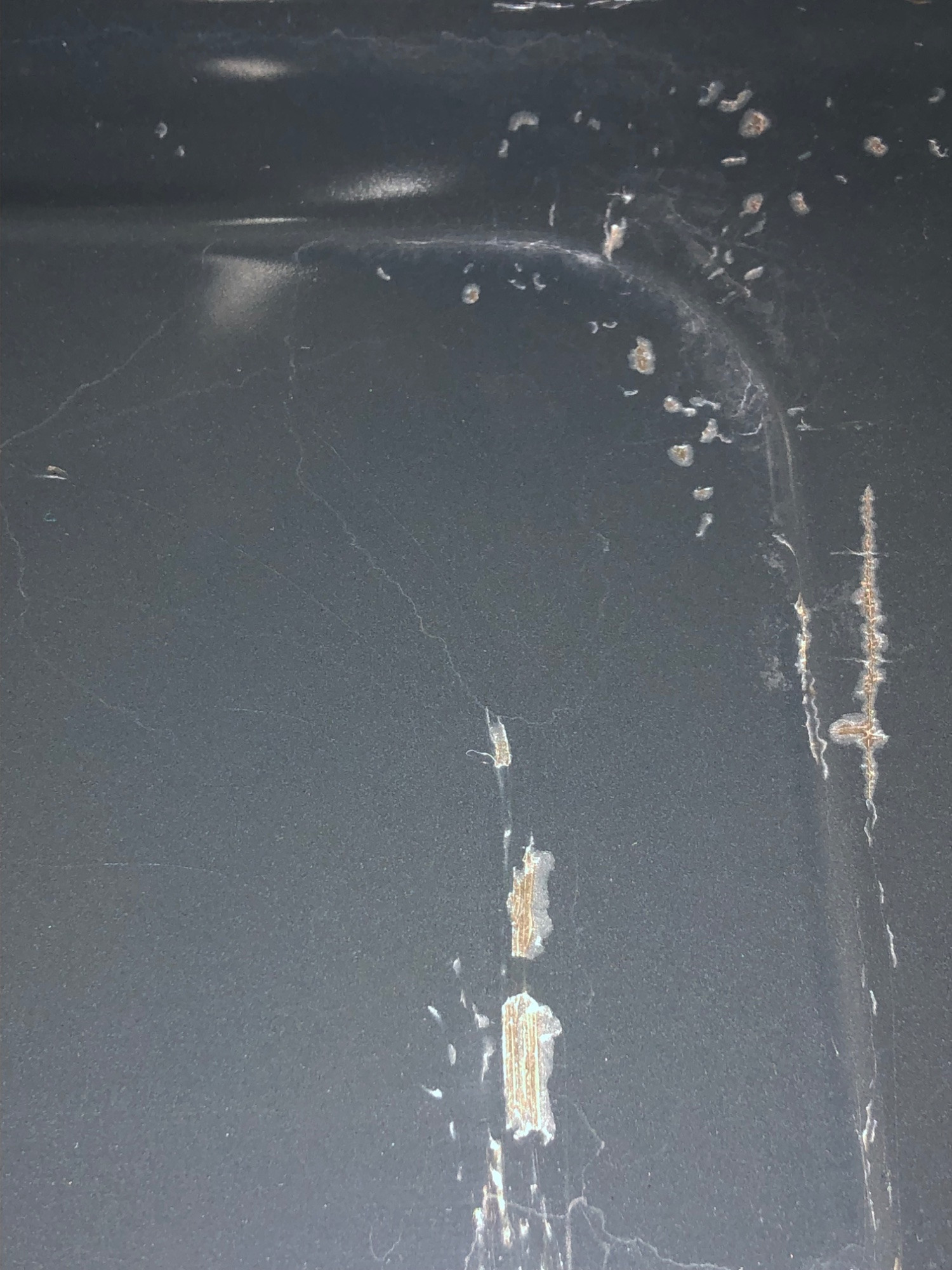 Meiner Ansicht nach muß folglich eine Auswirkung bzw. (Abplatz)Schaden deswegen auch nicht zwingend auf die direkte Wasserkontaktstelle beschränkt sein .. Die Bebilderung lässt mich vermuten, das da etappenweise bzw. in mehreren Vorgängen kleine, teils direkt nebeneinander liegende Emailstreifen abgeplatzt sind.
